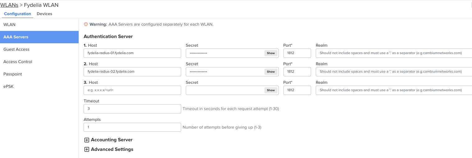 - Under AAA Servers enter the Fydelia RADIUS server details:
