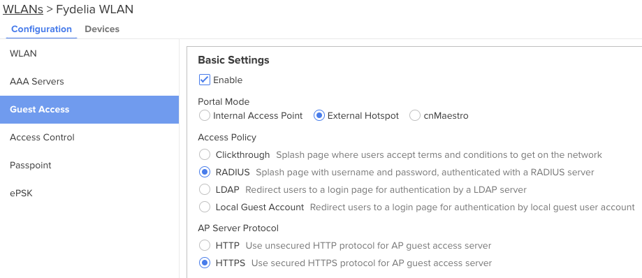 2. Under WLAN settings, Enable Guest access, set the policy to RADIUS and AP Server Protocol to HTTPS